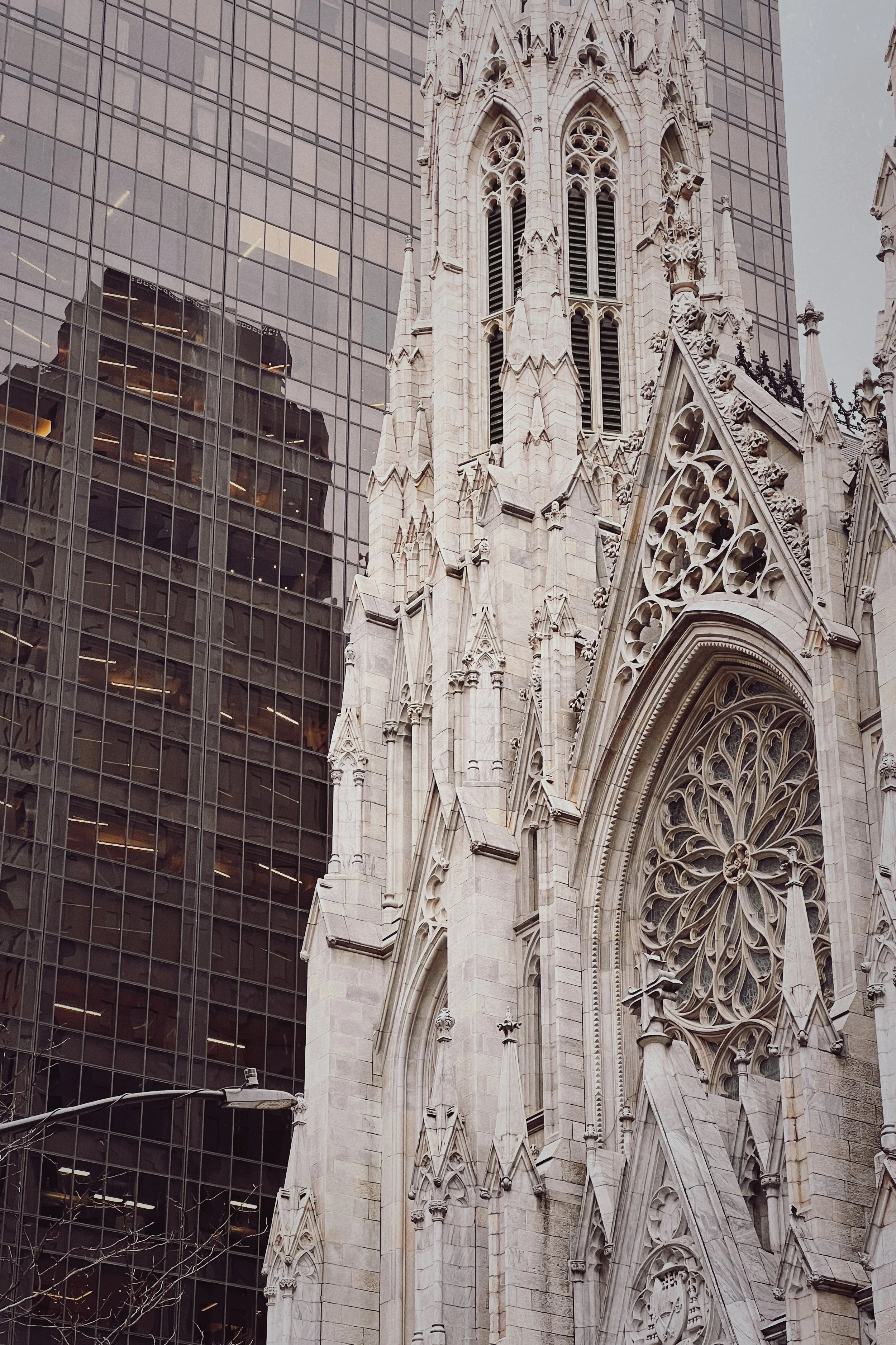 Shot of St. Patrick’s Cathedral, with its Gothic architecture, contrasting with the dark, Modernist building behind it on famous Fifth Avenue. Buy Print